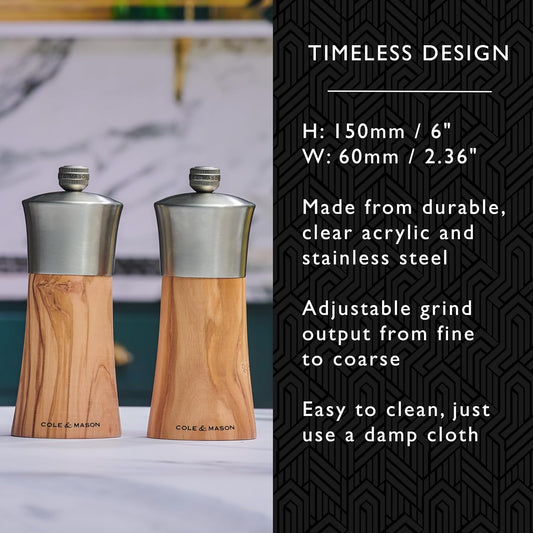 Cole & Mason Bromley Pepper Mill, 6" - Pepper Grinder with Ultra-Sharp Grinding Mechanism - Flavor-Enhancing Pepper Shaker - Refillable Mill with Adjustable Grinding - Olive Wood, Pepper Mill