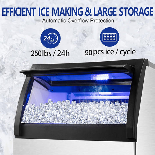 Commercial Ice Maker 250Lbs/24H Under Counter Ice Machine with 77Lbs Storage Bin, 90 Ice Cubes in 11Min, Stainless Steel Freestanding Ice Making Machine for Business, Water Filter and Scoop Included