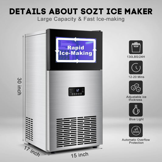 Commercial Ice Maker Machine 130Lbs/24H with 30Lbs Ice Capacity, 45Pcs Clear Ice Cubes Ready in 8-15Mins, Stainless Steel Under Counter Freestanding Large Ice Machine, 2 Water Inlet Modes