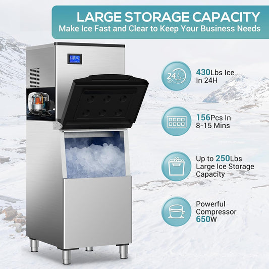 Commercial Ice Maker Machine 430Lbs/24H, Industrial Ice Machine 350 Lbs Storage Bin, 156PCS Clear Ice Cubes in 11 Mins, Freestanding Stainless Steel Ice Maker for Restaurants/Bar/Large Families
