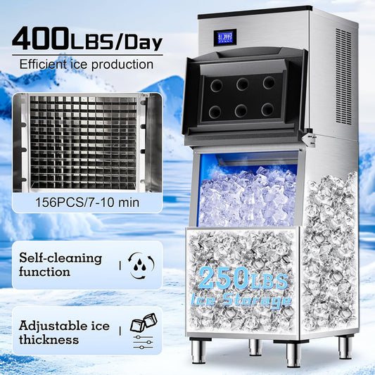 Commercial Ice Maker Machine 400Lbs/24H, Industrial Ice Machine 250 Lbs Storage Bin, 156PCS Clear Ice Cubes in 11 Mins, Freestanding Stainless Steel Ice Maker for Restaurants/Bar/Large Families