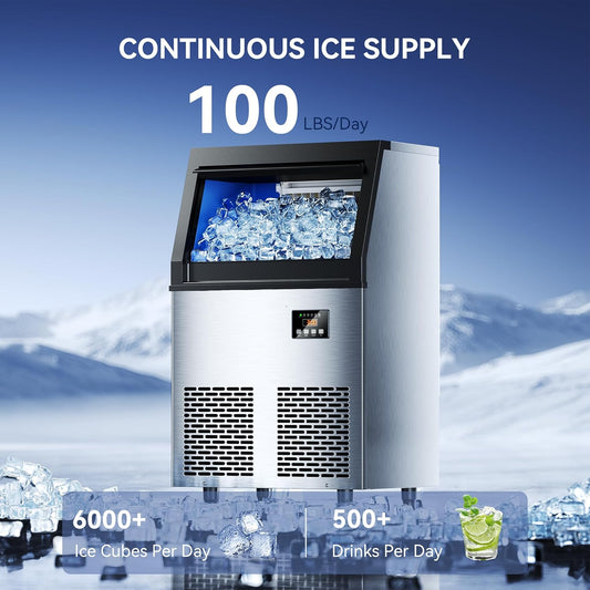 Commercial Ice Maker Machine, 100 lbs /24 h, 33 lbs Storage Bin, Stainless Steel, Compact, Embedded, Self-Cleaning, Perfect for Home/Office/Shop/Cafe, Includes Ice Scoop, Connection Hose