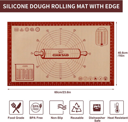 Cook's Aid Silicone Pastry Mat Extra Large with Measurements 26''x16'' for Reusable,Non-slip Silicone Baking Mat, Counter, Dough Rolling, Oven Liner,Fondant/Pie Crust, Red
