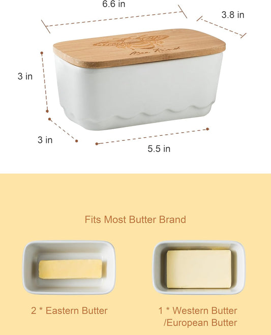 Covered Butter Dish for Countertop, Ceramic Butter Dish with Wooden Lid Airtight Butter Holder Container, Vintage HoneyBee Kitchen Decor, White