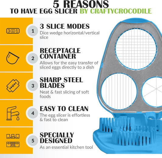 CraftyCrocodile Egg Slicer for Hard Boiled Eggs - 3 Slice Modes Egg Cutter, Heavy Duty, Stainless Steel Dicer - Kitchen Chopper Tool for Strawberry, Mushroom, Grape, Cherry Tomato - Blue