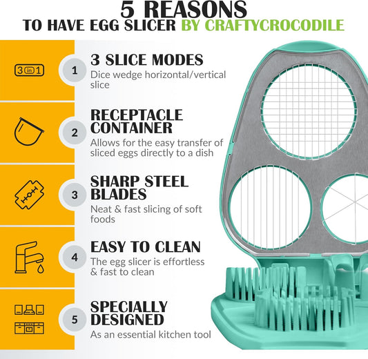 CraftyCrocodile Egg Slicer for Hard Boiled Eggs - 3 Slice Modes Egg Cutter, Heavy Duty, Stainless Steel Dicer - Kitchen Chopper Tool for Strawberry, Mushroom, Grape, Cherry Tomato - Mint Green