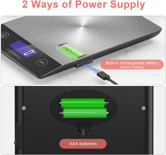 CROWNFUL Food Scale, Rechargeable 304 Stainless Steel Digital Kitchen Scale Upto 33lb Weight Grams and Ounces with LCD Display and Type-C Charging for Baking and Cooking