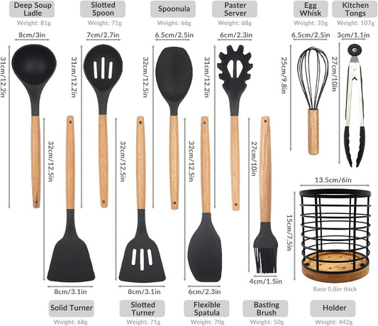 Daily Treasures 12PCS Kitchen Utensils Set,Cooking Utensils Set with Storage Holder,Kitchen Tools Made of Heat Resistant Food Grade Silicone and Wooden Handles for Nonstick Cookware