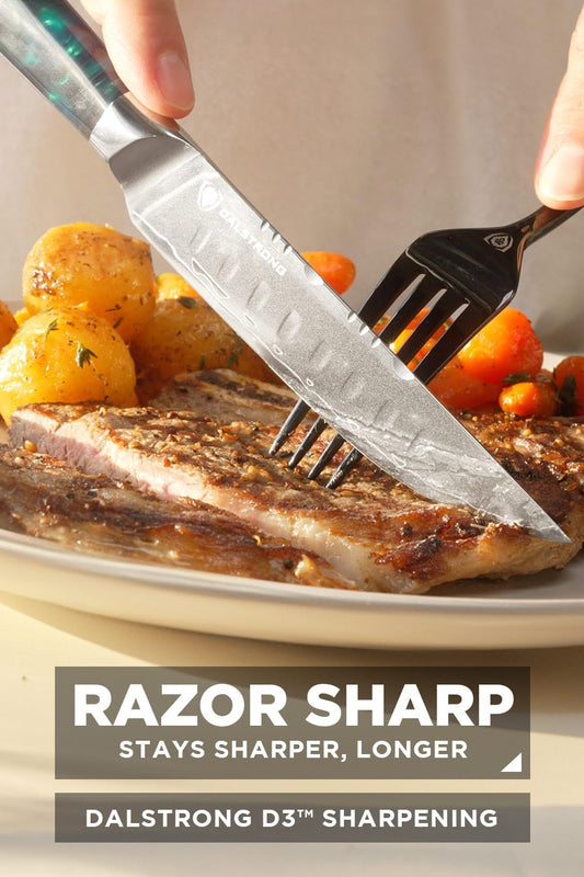 Dalstrong Steak Knives Block Set - 5 inch 4 Piece Set - Valhalla Series - Premium 9CR18MOV HC Steel - Celestial Resin & Wood Handle - Razor Sharp - Kitchen Cooking Chef's Knife - Leather Sheath