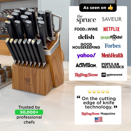 DALSTRONG Gladiator Series Elite-18pc Stainless Steel Knife Set with Block-High Carbon German Steel-Acacia Wood Block-Knife Set w/White Handles-NSF Certified-Men's Valentines Gift