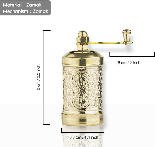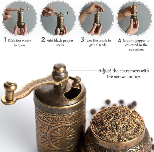 Decorative Black Pepper Grinder, Refillable Turkish Spice Mill with Adjustable Coarseness, Manual Pepper Mill with Handle, Spice Grinder Metal with Hand Crank, Antique Gold