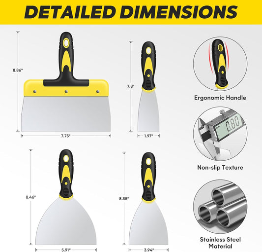 DEKEones Putty Knife Set, 4PCS Stainless Steel Scraper Paint Tool with Comfortable Grip for Drywall Repair, Wallpaper Removal and Plaster Scraping(2,4,6,8in)