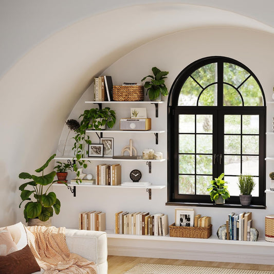 DINZI LVJ Long Wall Shelves, Set of 4, 31.5Inch Wall Mounted Shelves, Floating Shelves for Wall Storage with Metal Brackets, for Living Room, Bathroom, Bedroom, Kitchen, White and Gold