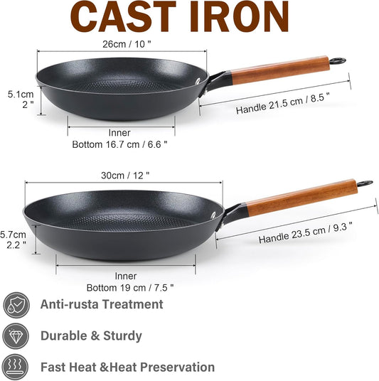 DM Cast Iron Skillet, 2 Piece Nonstick Frying Pan Set, 10 and 12 Inch with Detachable Acacia Wooden Handle, Honeycomb Non stick Omelet Egg Pan, Easy Clean Oven Safe Pans for Cooking