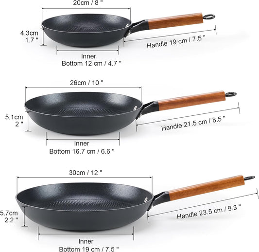 DM Cast Iron Skillet, 3 Piece Nonstick Frying Pan Set, 8” 10” 12” with Detachable Acacia Wooden Handle, Honeycomb Non stick Omelet Egg Pan, Easy Clean Oven Safe Pans for Cooking