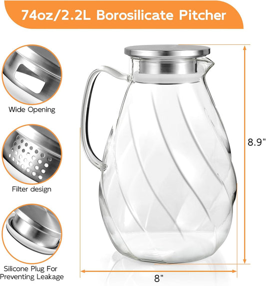 DRASTAR Glass Pitcher with Lid, 2.2L Water Pitcher, 74oz Tea Pitcher for Drinks, Borosilicate Glass Water Jug Cold Or Hot Beverages, Lemonade Pitcher, Glass Water Carafe With Lid