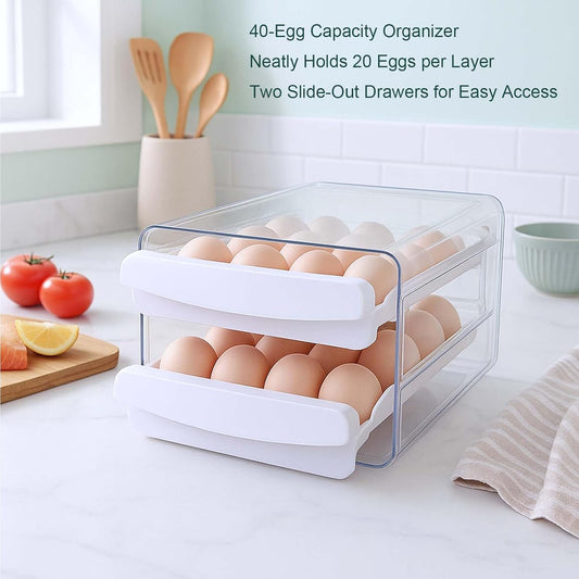 Egg Holder for Fridge, 2-Tier Stackable 40 Eggs Organizer Drawer for Refrigerator, Space-Saving Egg Container, Clear Plastic Egg Tray for Kitchen Storage