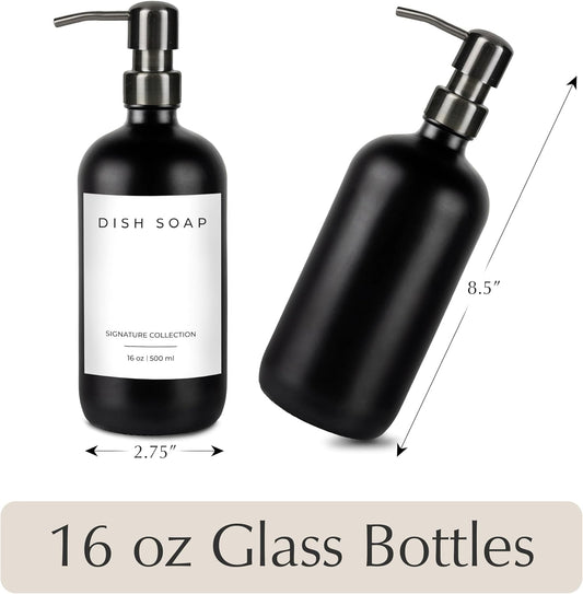 Emerson Essentials Soap Dispenser, Dish Bottles for Kitchen - Soap Bathroom Set, Glass Bottle Dispenser with Pump and Labels, 16 Oz | 2-Pack