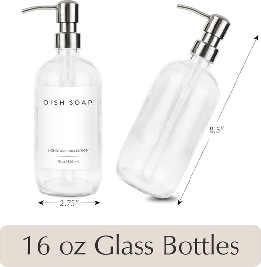 Emerson Glass Soap Dispenser Set - 16 Oz, 2-Pack with Pump and Labels for Kitchen and Bathroom