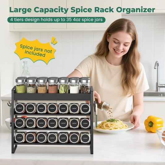 EsLuker.ly Spice Seasoning Rack Organizer Kitchen Countertop, 4 Tier Bamboo Spice Shelf Holder Storage with 4 Hooks, Wall Mounted Freestanding Stand for Pantry, Black (Jars Not Included)