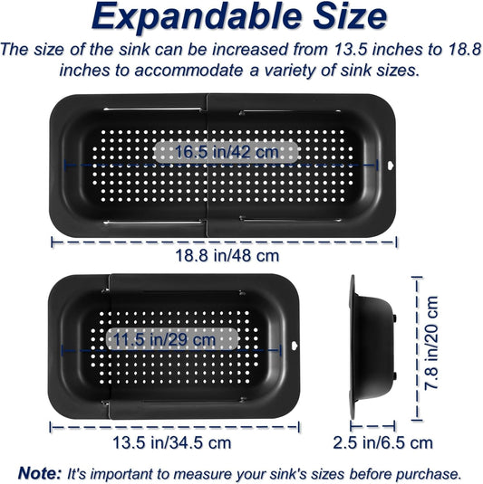 Extendable Sink Colander Strainer Basket - Wash Vegetables and Fruits, Drain Cooked Pasta and Dry Dishes - Adjustable Over the Sink Colander Collapsible Drainer Basket - Black