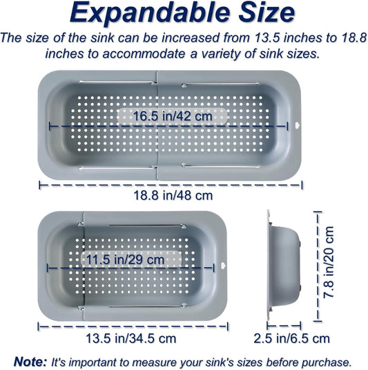 Extendable Sink Colander Strainer Basket - Wash Vegetables and Fruits, Drain Cooked Pasta and Dry Dishes - Adjustable Over the Sink Colander Collapsible Drainer Basket -Gray
