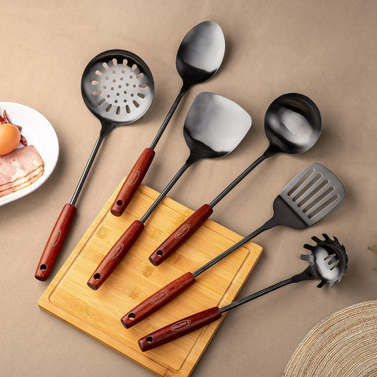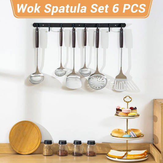FJNATINH Cooking Utensils - Spatula and ladle Set with Wood Handle, 6 Pieces Wok Utensils Tools - Wok Accessories Cookware Set