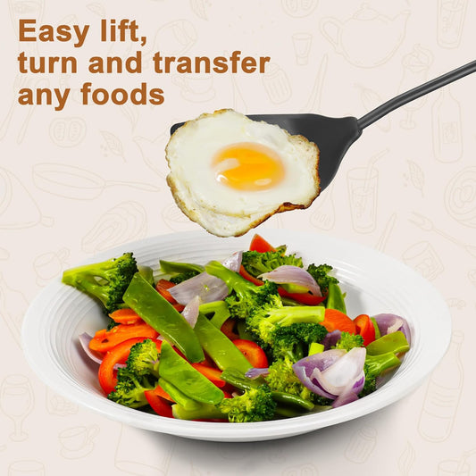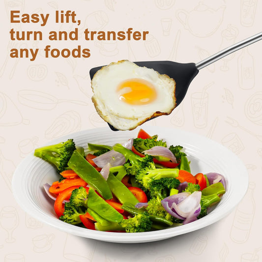 FJNATINH Silicone Spatulas and Turner Set - Stainless Steel Wok Tools, Wok Utensil, Non Stick Turners, Heat Resistant Rubber Spatulas for Fish, Eggs, Pancakes, Wok, Black of 2