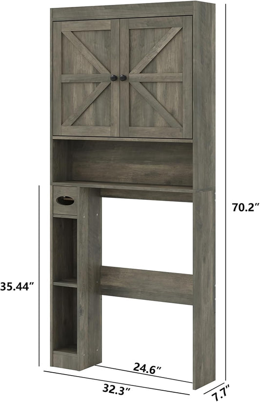 Furnideco 32.3''W Over The Toilet Storage Cabinet with Barn Doors, Over Toilet Shelf Farmhouse Storage Cabinet Space Saver with Toilet Paper Holder & Adjustable Bottom Bar, Gray