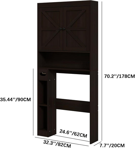 Furnideco 32.3''W Over The Toilet Storage Cabinet with Barn Doors, Over Toilet Shelf Farmhouse Storage Cabinet Space Saver with Toilet Paper Holder & Adjustable Bottom Bar, Espresso