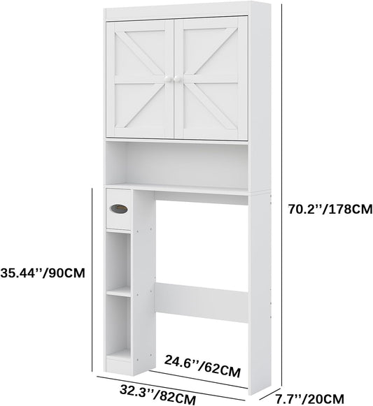Furnideco Over The Toilet Storage Cabinet with Barn Doors, 32.3''W Free Standing Toilet Storage Shelf Space Saver with Adjustable Bottom Bar, White