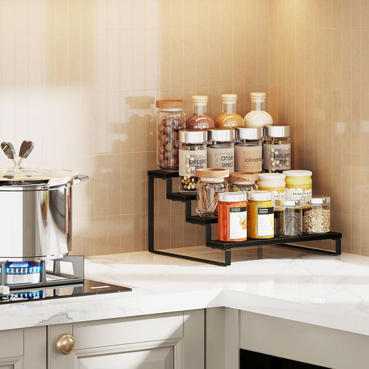Giikin 3 Tier Spice Rack, Cabinet Organizer Shelf, Wooden Spice Rack for Countertop, Kitchen Counter Storage Shelves Cupcake Stand Holder Display Stand, Black