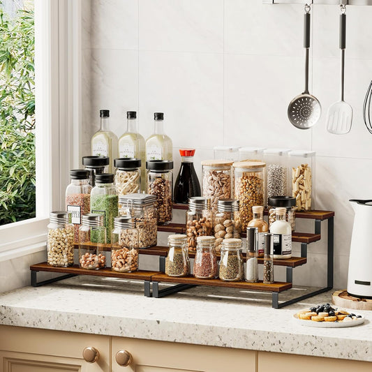 Giikin 3-Tier Spice Rack, 13.8 Inch Wood Step Shelf Countertop Spice Storage Holder, Kitchen Pantry Cabinet Organizer Cupboard for Spice Bottles, Jars, Seasonings, Baking Supplies, Metal Frame