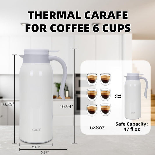 GiNT 51 Oz Stainless Steel Thermal Coffee Carafe, Double Walled Vacuum Insulated Flask, 12 Hour Heat Retention, 1.5 Liter Tea, Water, and Coffee Dispenser (Upgraded version White)