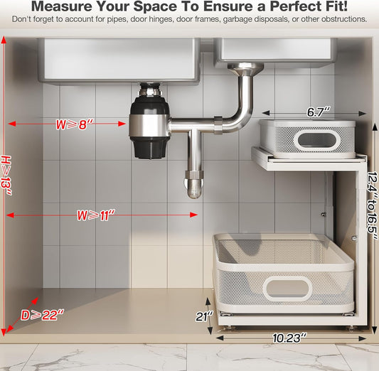 2 Pack 21IN-Depth Under Sink Organizer With Next-Gen Ball-Bearing Slides,2-Tier Precision Mesh Pull Out Cabinet Storage for Bathroom&Kitchen,Height Adjustable Drawers Shelf,Anti-rust-White