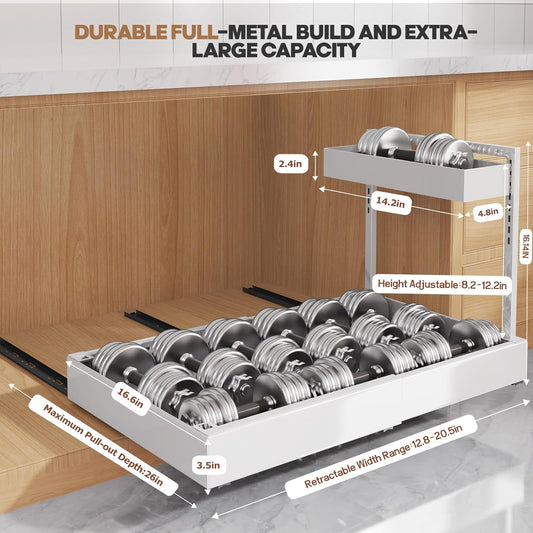 1-Pack L-Shape Expandable Under Sink Organizer with 3 Ball-Bearing Slide Rails,2-Tier Pull-Out Under Cabinet Storage Shelf for Kitchen & Bathroom,Height-Adjustable Slide-Out Cabinet Drawer-White