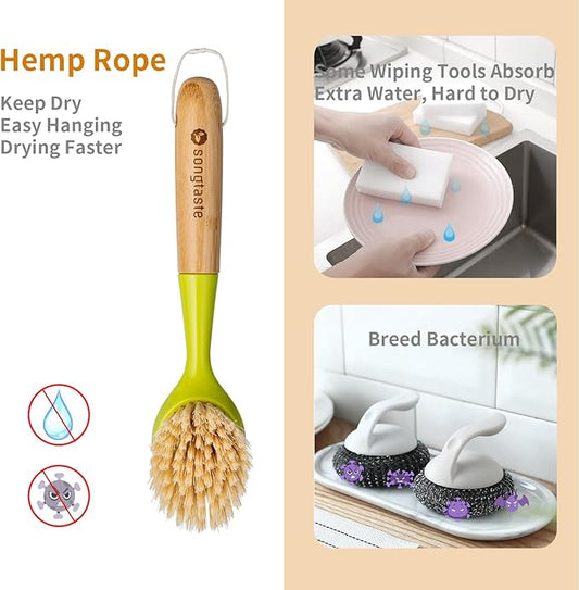 2 Pack Kitchen Dish Brush Bamboo Handle Dish Scrubber Built-in Scraper, Scrub Brush for Pans, Pots, Kitchen Sink Cleaning, Dishwashing and Cleaning Brushes are Perfect Cleaning Tools, Color-Green
