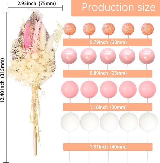 Gyufise 57Pcs Balls Cake Topper Boho Grass Cake topper Pearl Balls Acrylic Happy Birthday Cake Decorations for Wedding Baby Shower Birthday Boho Themed Party Supplies Pink