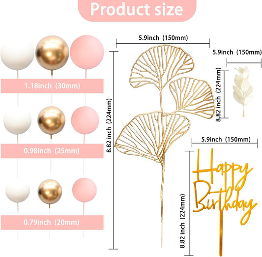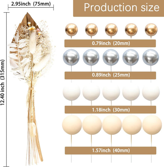Gyufise 21 Pack Flower Boho Cake Topper Ball Cake Decorations Palm Leaves Plants Cake Decor for Girl Bohemian Princess Theme Wedding Baby Shower Birthday Party Supplies White Gold