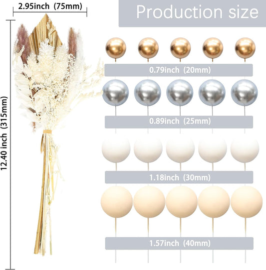 Gyufise 57Pcs Khaki Balls Cake Topper Boho Grass Cake topper Pearl Balls Acrylic Happy Birthday Cake Decorations for Wedding Baby Shower Birthday Boho Themed Party Supplies Khaki White Gold