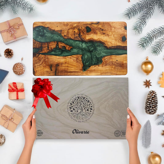 Handmade Epoxy Cutting Board & Charcuterie Board - Decorative, Olive Wood Boards for Serving Cheese, Fruit, Meat - Ideal for Kitchen, Unique Housewarming Gift - Emerald Resin