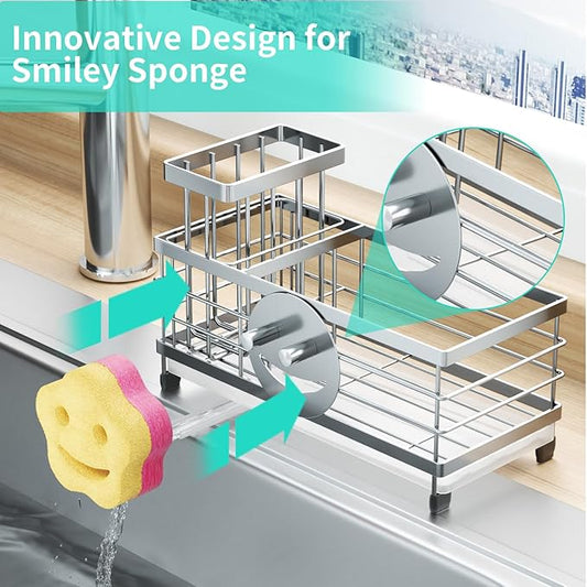 HapiRm Sponge Holder for Kitchen Sink - Self-draining Sink Caddy with Smiley Face and Brush Holder, Stainless Steel Kitchen Organizer for Countertop - Silver
