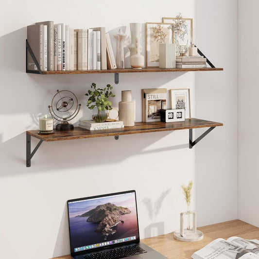 Heimlove Deep Floating Shelves for Wall, 48W x 12D Wood Wall Shelves Set of 2, Wide Floating Bookshelf for Living Room, Kitchen, Office, Bedroom and Decor Storage, with Metal Bracket - Rustic Brown