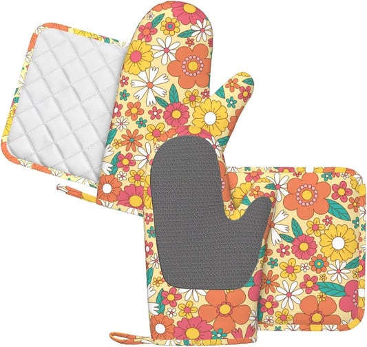 Hippie Groovy Flower Oven Mitts Pot Holders Set Silicone Heat Resistant Flowers Florals Pattern Oven Mitts and Hot Pads Potholders Non-Slip Oven Gloves for Cooking Baking Grilling BBQ