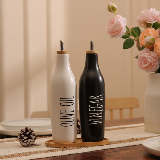 HOMCDALY Olive Oil and Vinegar Dispenser Set, Ceramic Oil and Vinegar Bottles with Bamboo Tray, 16.9oz Kitchen Cruet - Set of 2 - Black