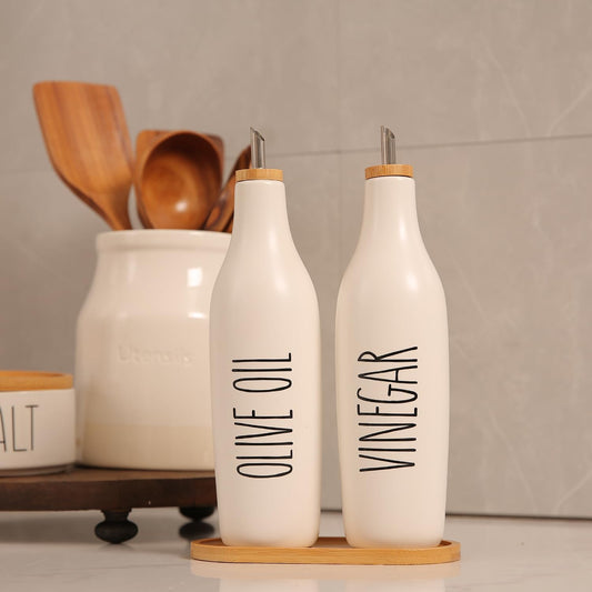 HOMCDALY Premium Olive Oil Dispenser for Kitchen, 11.8oz Glass Oil Bottles with Bamboo Tray, White Oil&Vinegar Cruet Set, Kitchen Dispenser Bottles with Pourer| Set of 2 (11.8oz –P–White)