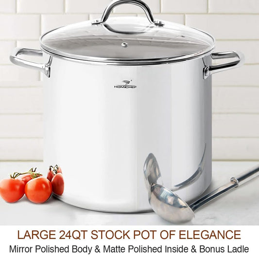 HOMICHEF LARGE STOCK POT 24 Quart With Lid - Nickel Free Stainless Steel Cookware Stockpot 24 Quart - Healthy Cookware Polished Stockpots - Heavy Duty Induction Pot Soup Pot With Lid