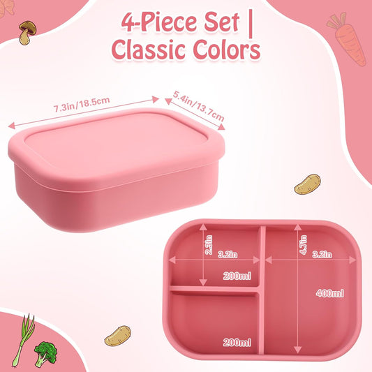 Honeydak 4 Pcs Silicone Bento Lunch Box 3 Compartment Reusable Leakproof Silicone Bento Lunch Container for Adults Microwave Dishwasher Freezer Safe(Red)