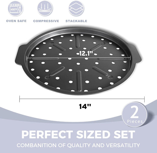 HONGBAKE 2 Pack Pizza Pan 14 Inch with Holes, Rust-Free Nonstick Pizza Pan for Oven, 0.8mm Carbon Steel Perforated Pizza Tray with Wider Handles, Round Baking Sheet for Frozen & Homemade Pizza, Grey