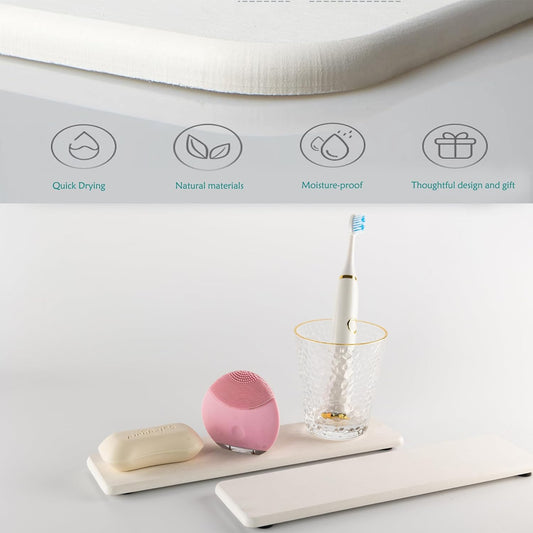 2 Pcs Water Absorbing Stone Trays, Kitchen/Bathroom Sink Soap Dish, Diatomite Tray Used for Hand Soap & Cosmetic Bottles in The Modern Home, 3.15" W x 11.8" L, White